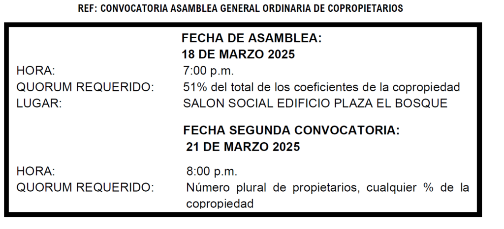 Asambleas CONVOCATORIA ASAMBLEA GENERAL ORDINARIA DE COPROPIETARIOS BAJAR CONVOCATORIA AQUI → BAJAR PODER →